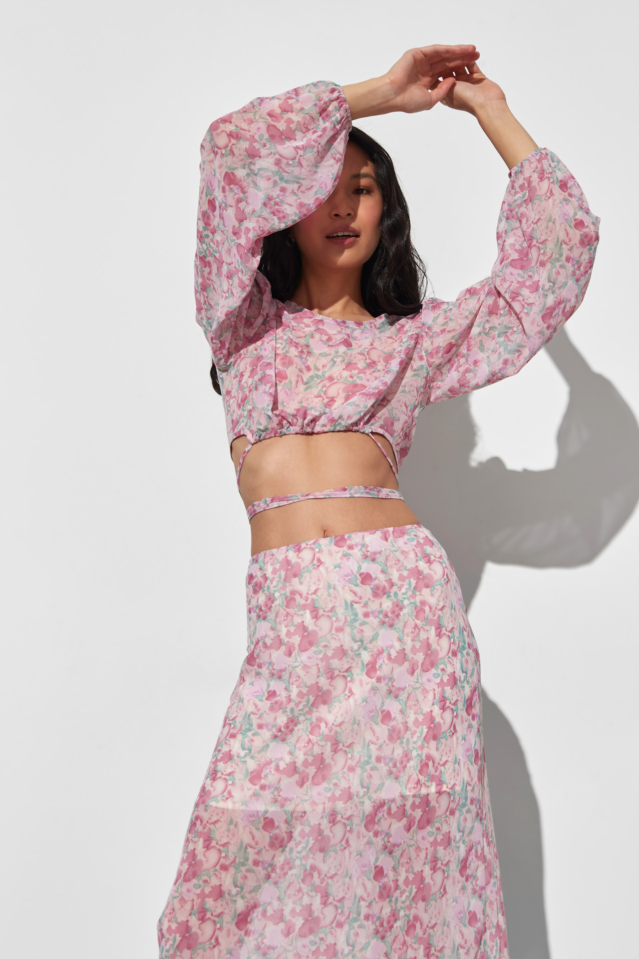 Укороченная блуза сиреневая с открытыми плечами и длинными рукавами